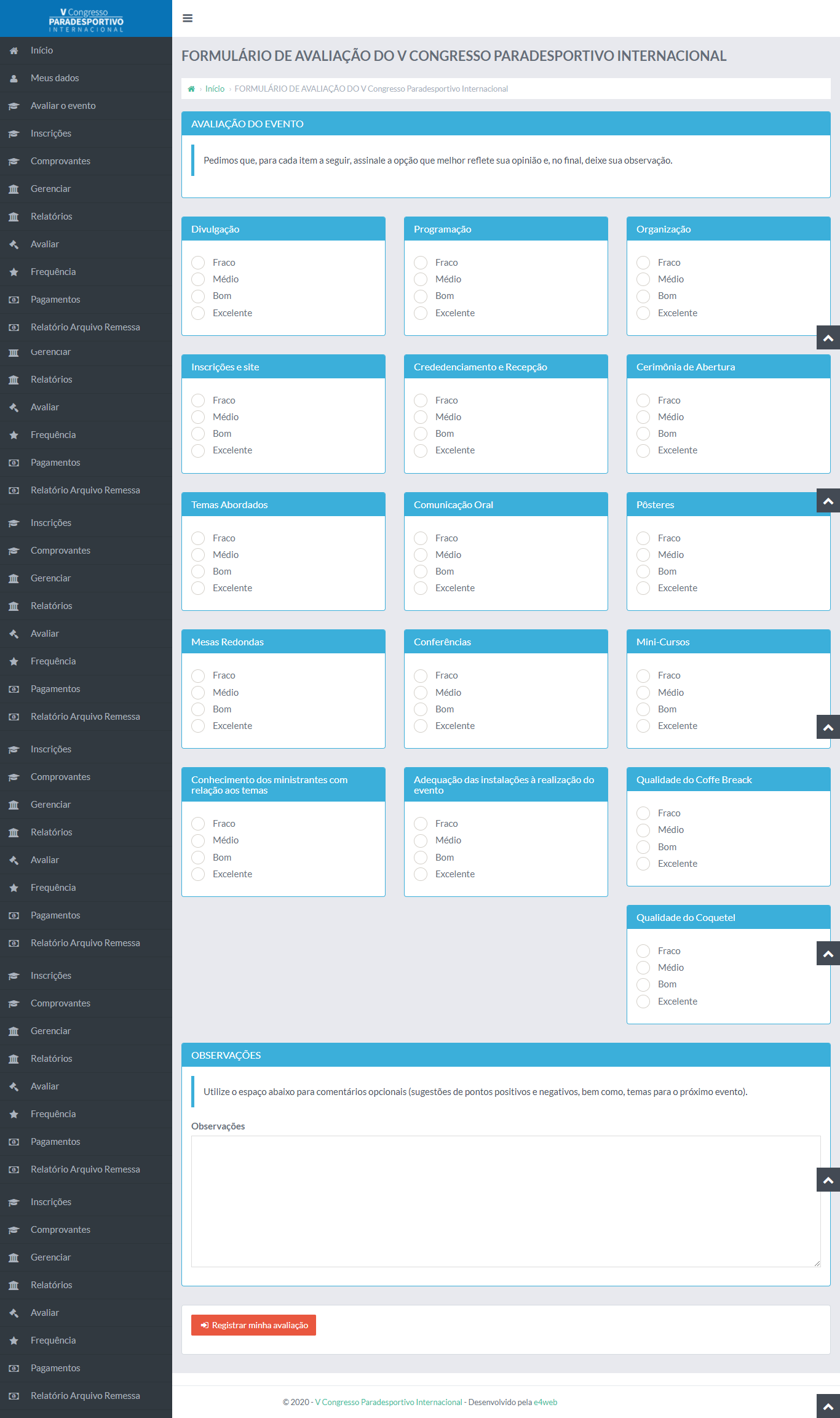 Funcionalidades do sistema: Módulo de inscrição em minicursos; Módulo de submissão de propostas de trabalho; Módulo de avaliação de propostas de trabalho; Emissão de comprovantes de incrição; Emissão de certificados; Pesquisa de satisfação; Módulo de gerenciamento de cadastro de participantes, períodos de inscrição e pagamentos; Registro de frequência das atividades; Módulo de Credenciamento; Relatórios de inscrições; Relatórios Estatísticos; Módulo de submissão de resumo expandido; Compilação de resumos para publicação.